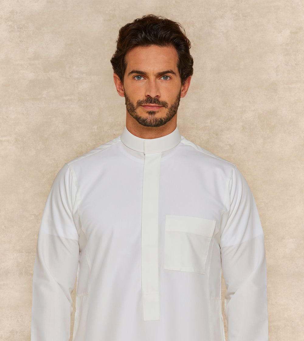 ثوب جاهز للارتداء بتصميم كلاسيكي للاستخدام اليومي، مصنوع من قماش ناعم وخفيف الوزن، بياقة ماندرين، وأكمام عادية، وسحاب مخفي. مصنوع من قماش بوليستر ١٠٠٪.