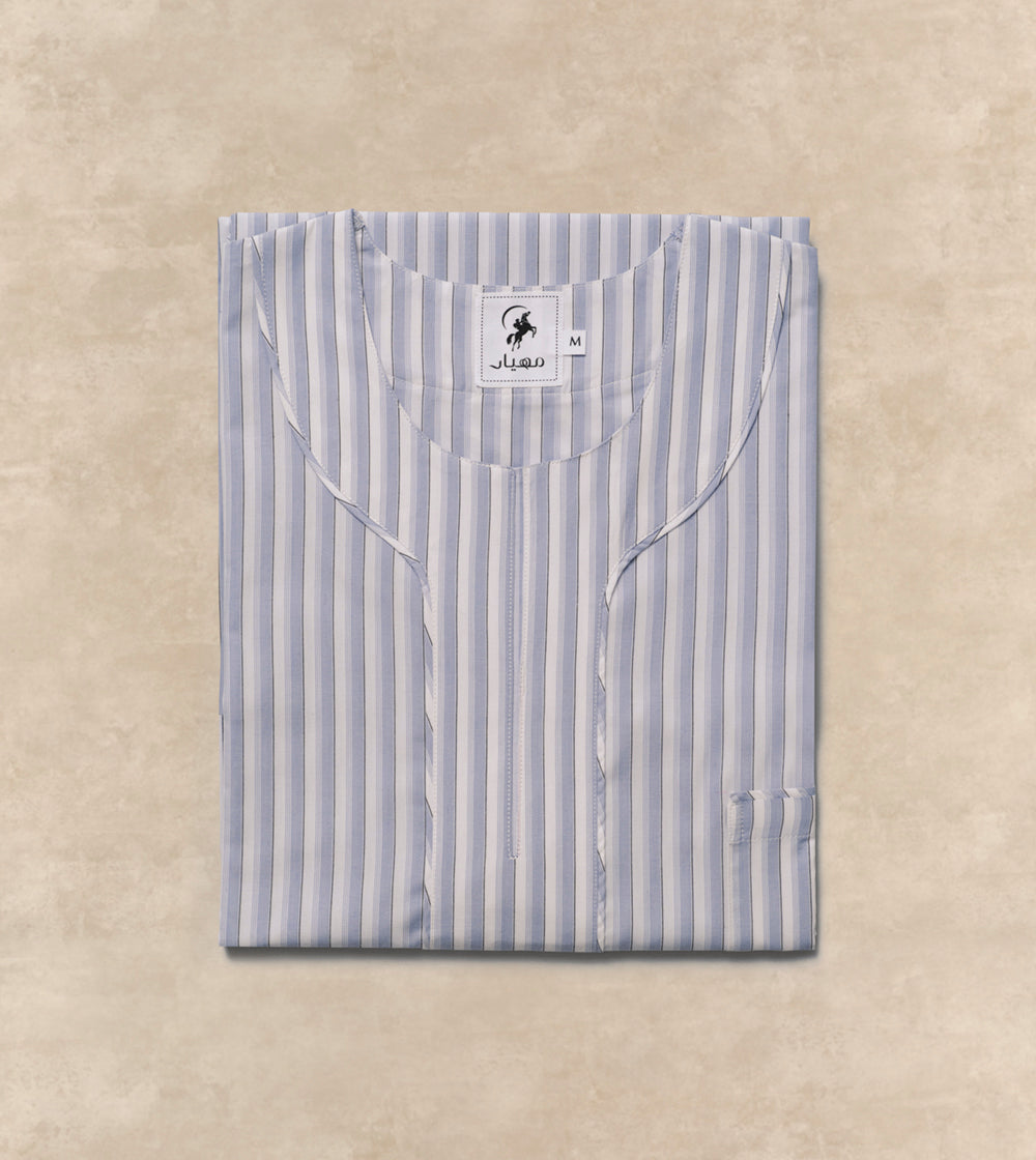 تتميز هذه الجلابية بخطوط بيضاء وزرقاء أنيقة، وهي مصممة للارتداء المريح. مزيجها الخفيف مثالي للحفاظ على البرودة خلال ذروة الصيف. مثالية للاسترخاء في المنزل أو طوال اليوم.