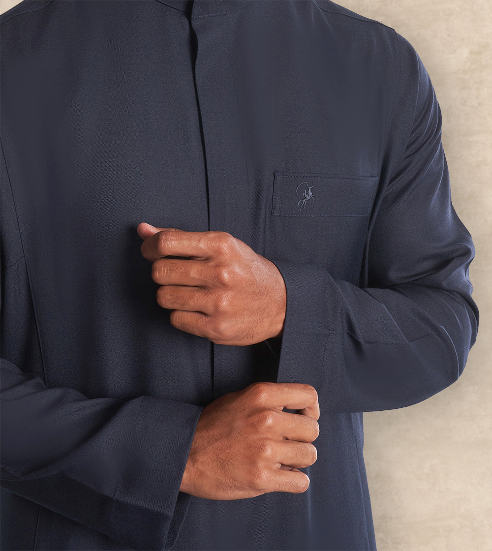 Casual colored winter thobe for daily use, with mandarin collar, concealed zipper at placket, regular sleeve, designer trim fabric at collar and pocket edging. Made with high quality 85% polyester 15% viscose fabric with no crease property.