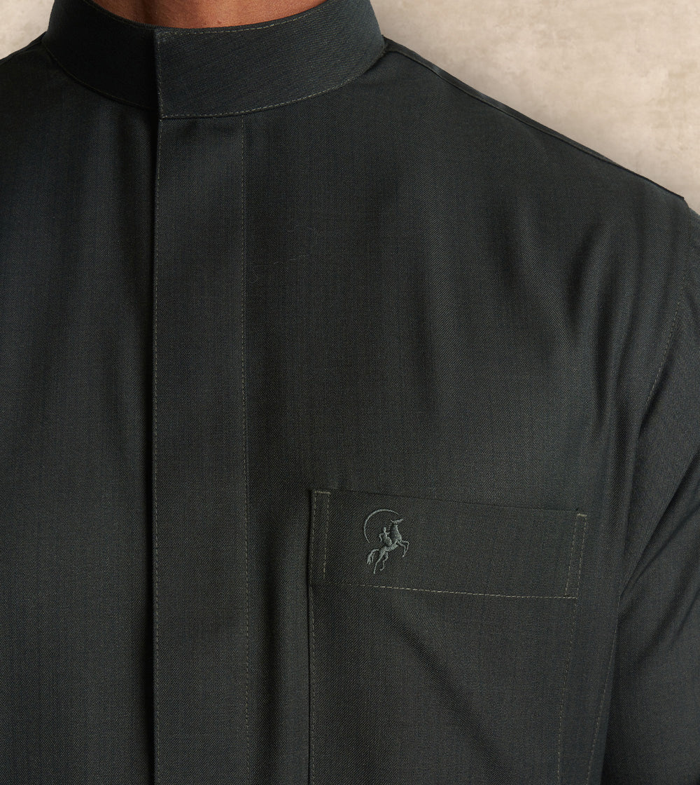 Casual colored winter thobe for daily use, with mandarin collar, blunt edge finishing at placket with concealed zipper placket and regular sleeve. Made with high quality 88% polyester 12% viscose fabric with no crease property.