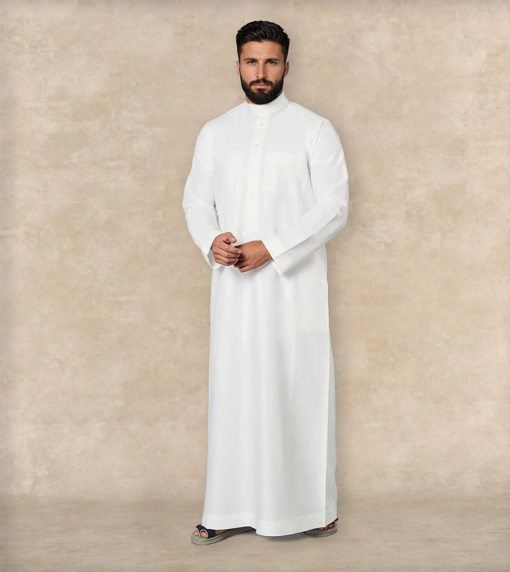 This ready-to-wear thobe features a classic design. styled with a mandarin collar with concealed zipper placket and regular sleeves, Made with 100 % Polyester fabric with less crease property.