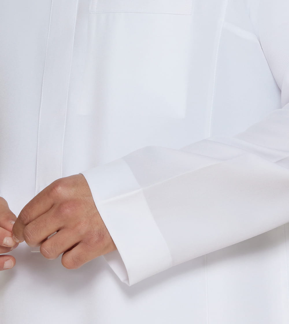 This thobe features a classic design, perfect for special occasions. It’s styled with a mandarin collar with concealed zipper placket, and regular sleeve. tailored to impress, it’s the ideal choice for sophisticated gatherings.