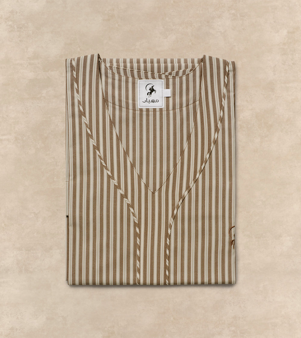A lightweight jalabia in brown stripes offering a natural, earthy aesthetic. Crafted from a cooling poly-cotton blend, it keeps you comfortable and composed all day long. Perfect for lounging at home or relaxing throughout the day.