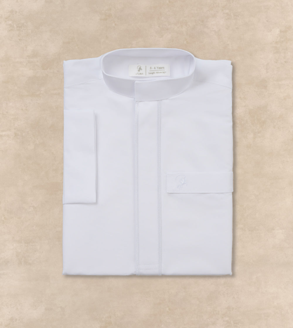 Let your young one step out in confidence and style with this classic thobe, timeless in design and crafted for ease, movement, and everyday pride. Tailored for boys aged 2-6 years, styled with a mandarin collar, concealed zipper placket with regular sleeves for a polished yet comfortable fit.