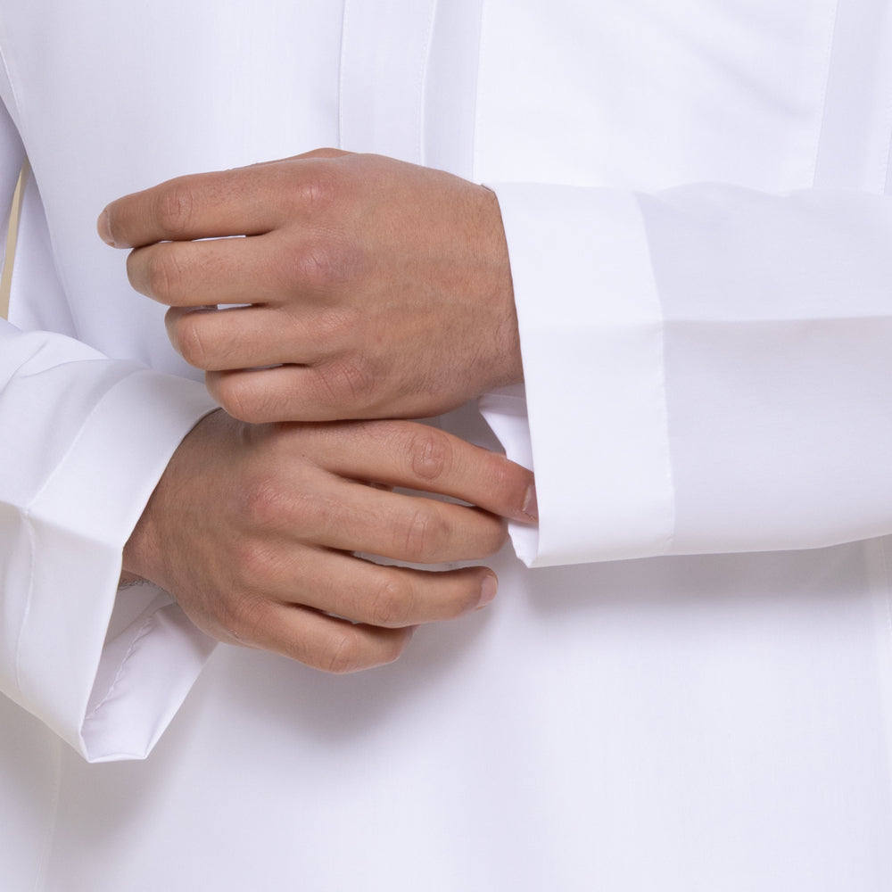 This ready-to-wear thobe is crafted from high quality polyester with a soft hand feel, excellent drape, and minimal creasing—designed for both style and ease.