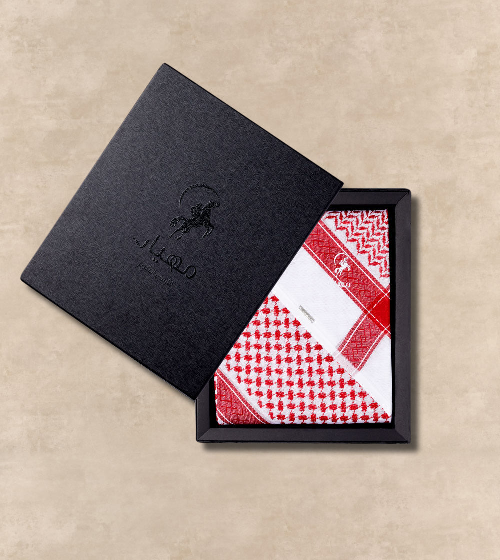 Elevate your wardrobe with Mihyar’s Premium English Shemagh—crafted from superfine 100% cotton woven in England. This high-end piece features a distinguished jacquard design and the signature Mihyar metal logo, blending luxury with cultural pride. Lightweight, breathable, and styled for those who appreciate refined craftsmanship, it’s the perfect choice for weddings, official events, or sophisticated everyday wear.
